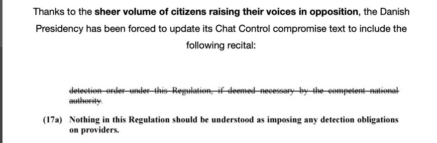 EDIT: I missed this in my original reporting, but the outrage towards this particular wording has worked: the Danish presidency updated the text to unambiguously state that no detection is mandatory. This is great news, as it only leaves open complaints about the ineffectiveness of the voluntary checks.